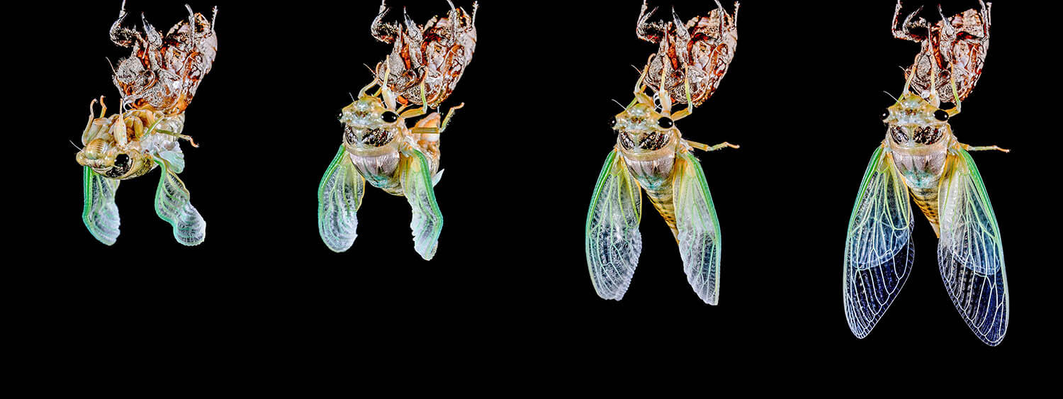 Once the time comes, they will come out at night. This is when they shed their skins and take about a month to eat, mate, and lay eggs before dying. When the eggs hatch, they start their life cycle as nymphs and burrow deep under the soil once they fall to the ground. They feed on the tree sap from underground roots. After another 13 or 17 years, the cycle begins again.